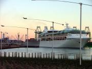 thats the Royal Carribean..the smaller ol navy ship is a museum..SS Lane Victory!