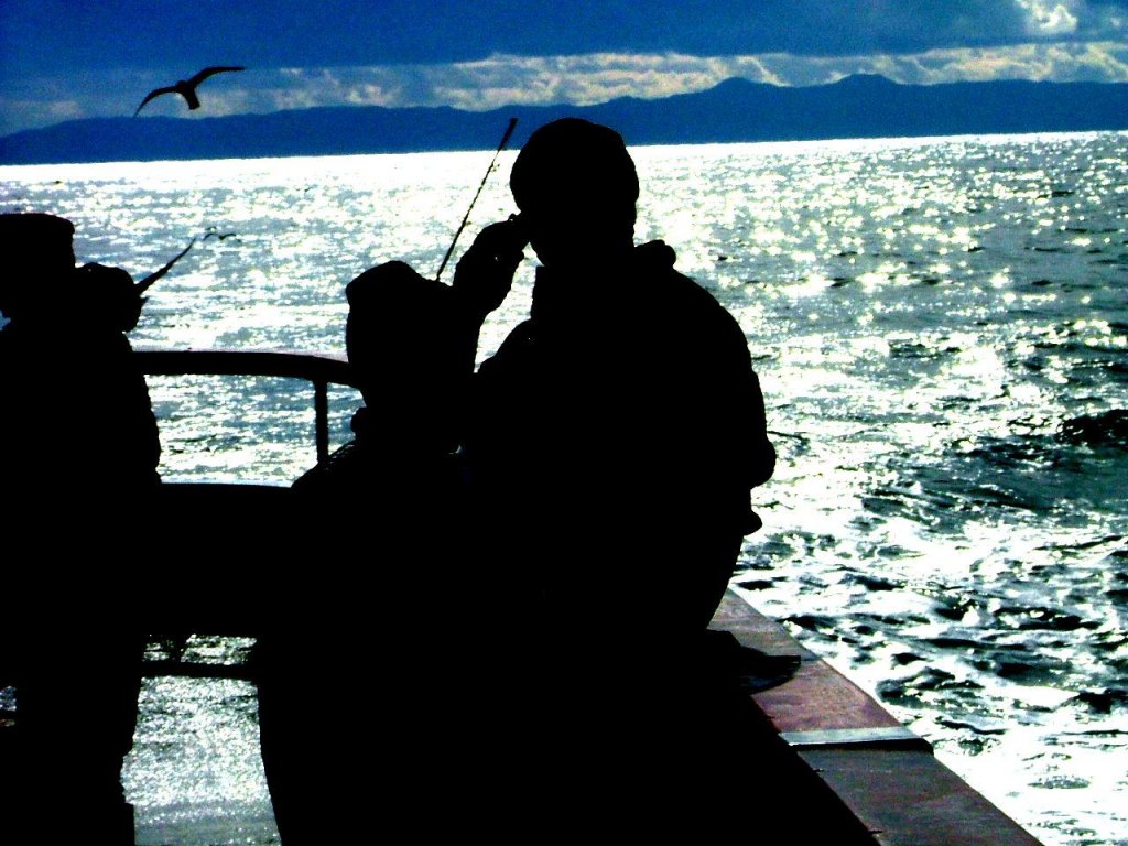 Pop and sons gone fishin' between catalina and Los Angeles...pic taken against sun causing sihlouette..check spelling...changed to watercolor w/ pic editor